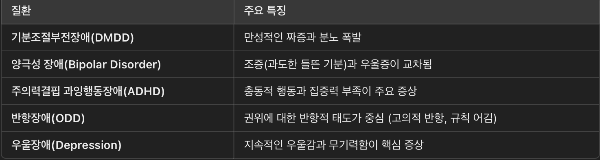 DMDD는 기분이 쉽게 변하는 양극성 장애와 다르며, ADHD와 동반될 수 있음.