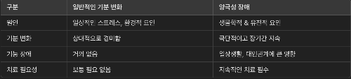 일반적인 감정 기복과 다르게 극단적이고 장기적으로 지속되어 일상생활과 사회 기능에 큰 영향을 미칠 수 있다.
