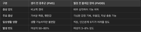 특징: 생리 전 증후군(PMS)보다 훨씬 심한 형태로, 일상생활에 영향을 미칠 수 있어.